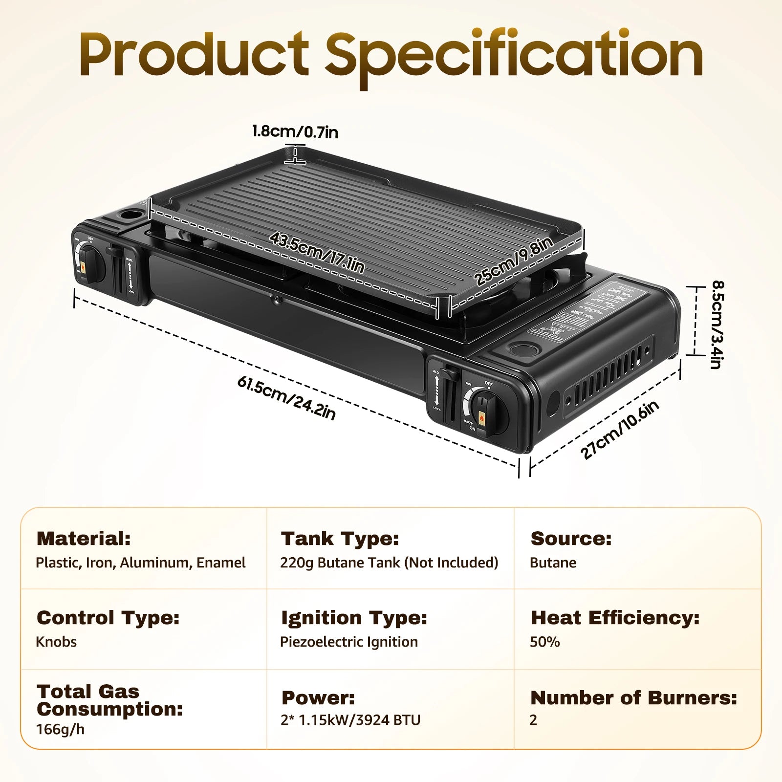 - Multi-Purpose Fuel Stove: This 2 burner butane stove allows you to prepare a variety of dishes effortlessly, whether you're camping, hiking, or tailgating.
